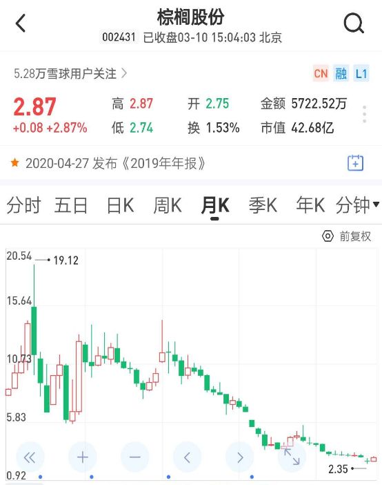 棕榈股份,很多人可能都没有听过它的名字,打开交易软件,发现它有很多貌似不相干的概念:美丽中国、雄安新区、虚拟现实、横琴新区等等。这家公司2010年6月10日上市,当日收盘价为6.82,到2020年3月10日,还差三个月满十岁生日,股价收盘却只有2.87,不及一半,令人唏嘘。